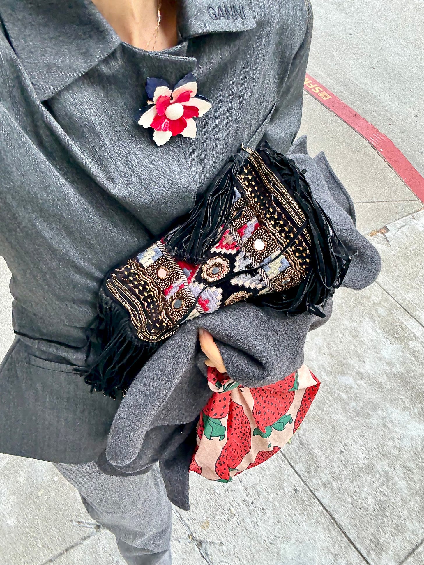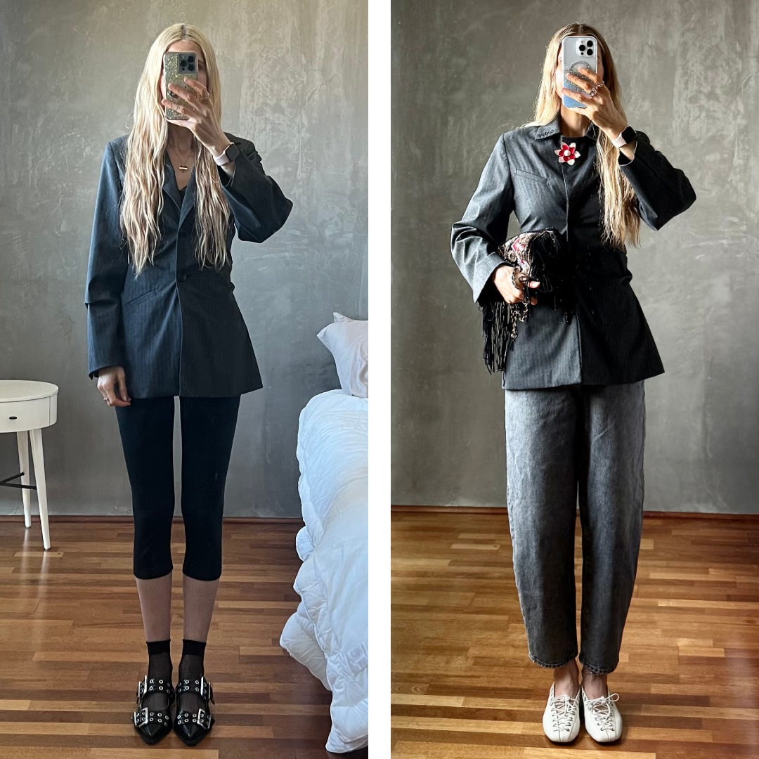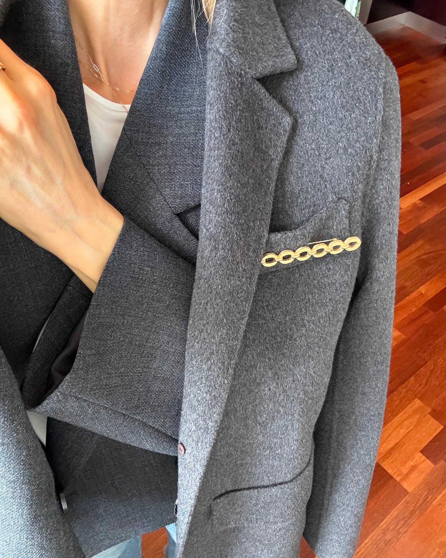 Which is exactly how I felt putting a brooch on it. I’m a serial outfit repeater, so I’m always motivated to find different ways to style my wardrobe to avoid feeling stale. I’m happy to report that the Nanushka gray blazer jacket I’ve worn a casual 47 times this year and Ganni gray blazer that I’ve only worn 12 times (both via