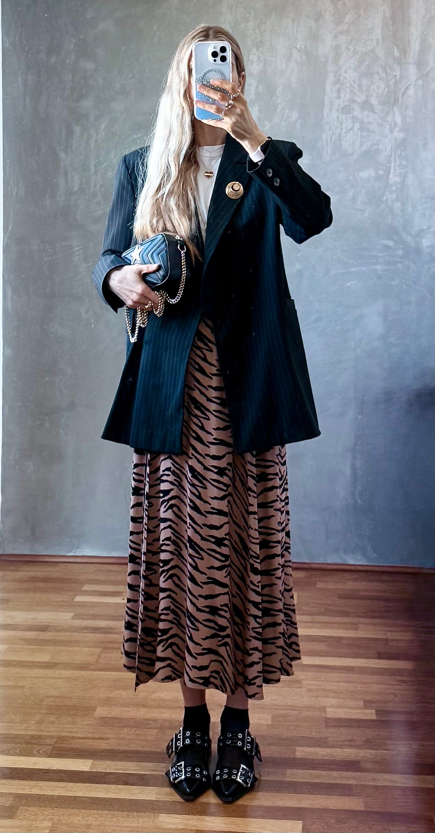 I felt very much like my grandmother since she really features1 a longline blazer + brooch combo, and took things up a notch with an animal print skirt and pointy flats.
