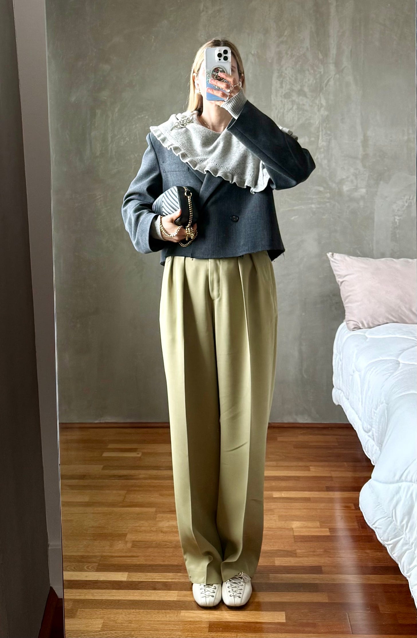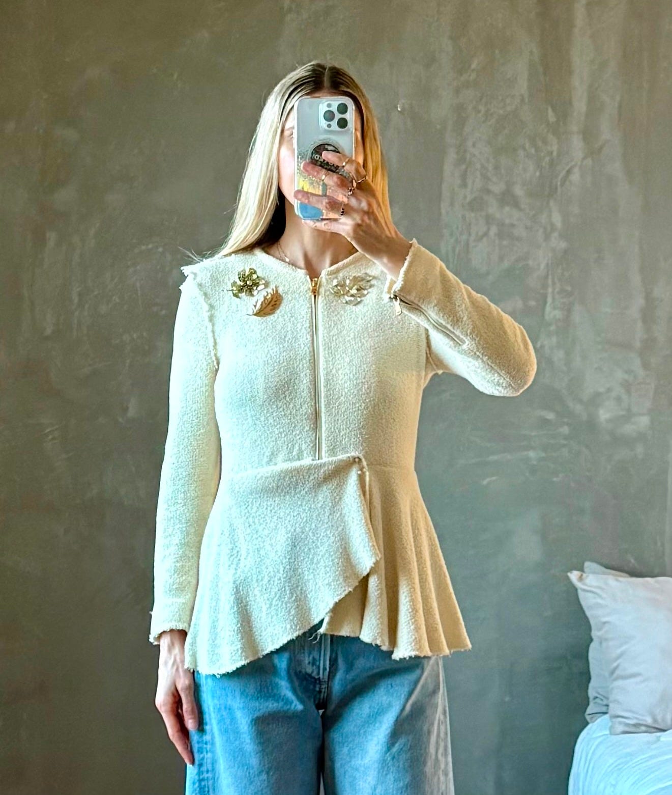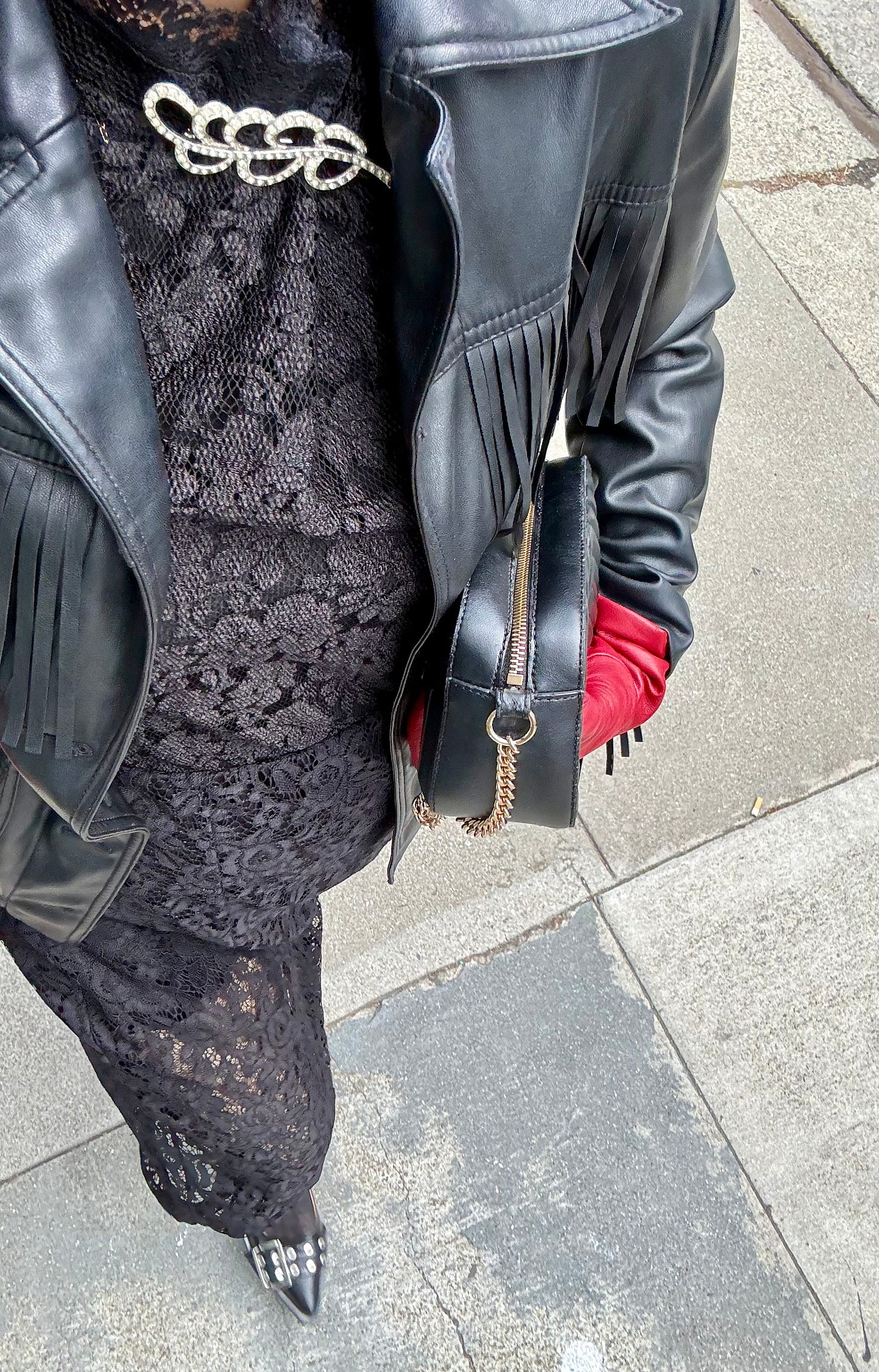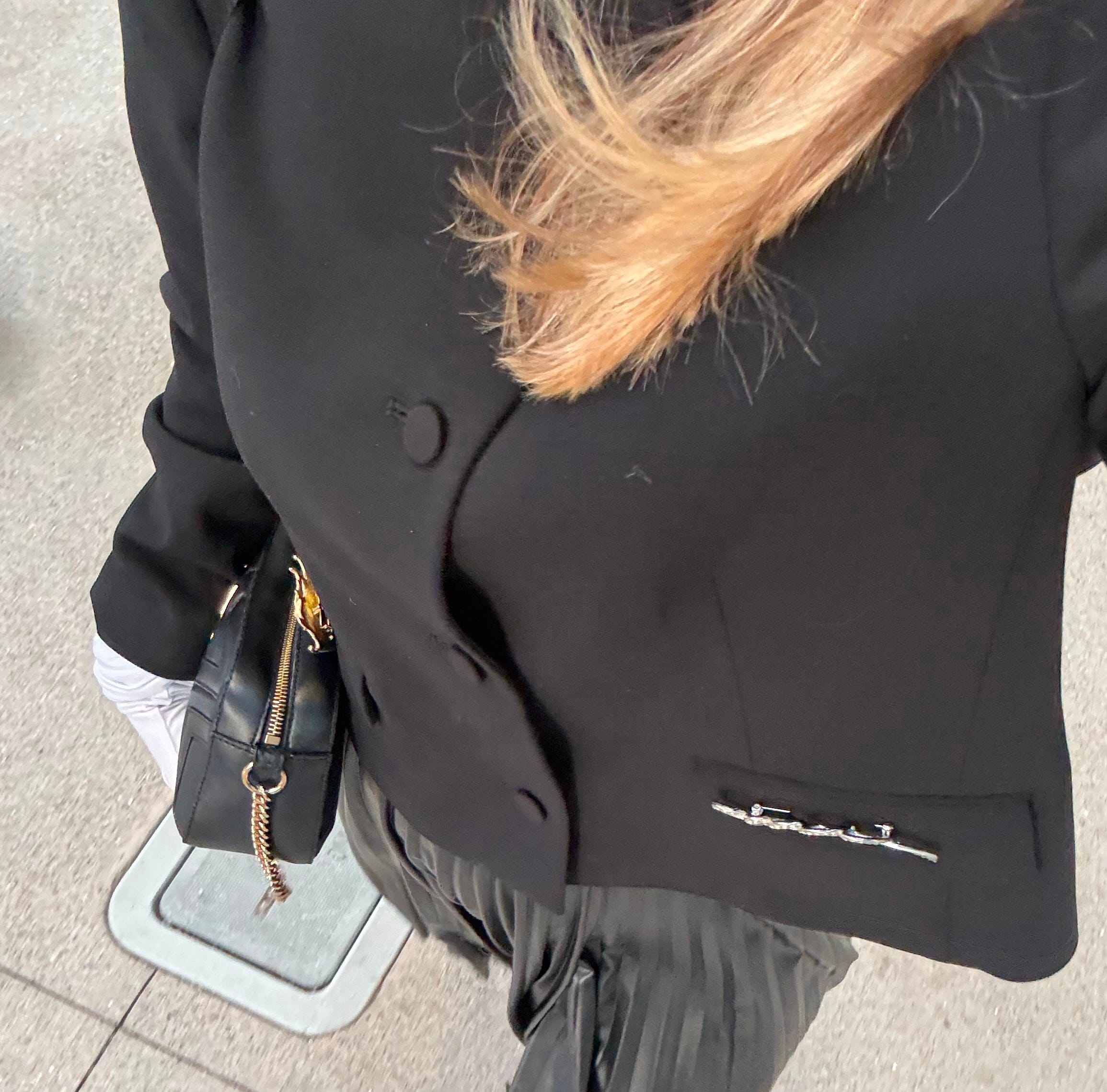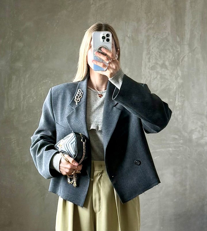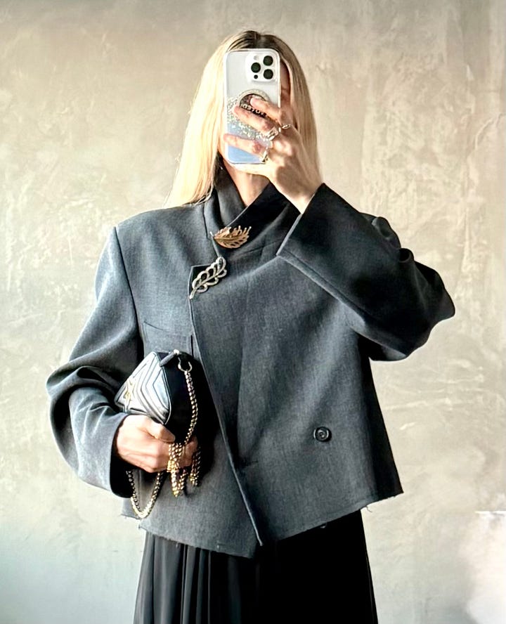 This cropped jacket was my first 2026 purchase via The RealReal. I brooched it out of the gate here and here and wanted to try a different placement with my rhinestone brooch. After very scientifically holding my brooches up against various parts of my jacket, I hit the jackpot with my flap pockets. I have big plans to line brooches down the front like fancy buttons next.