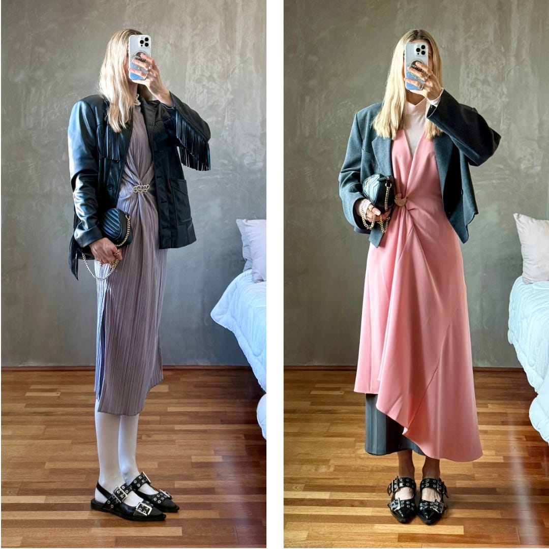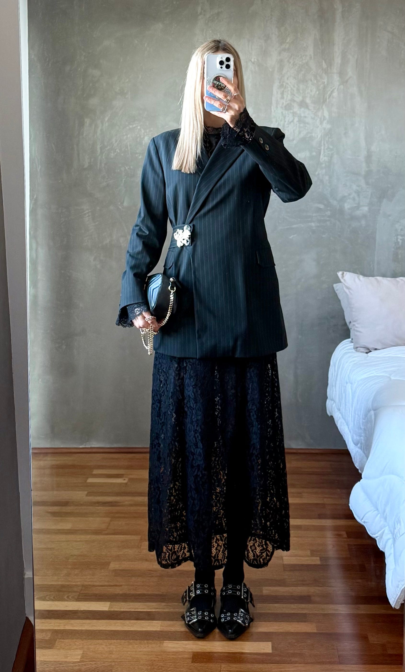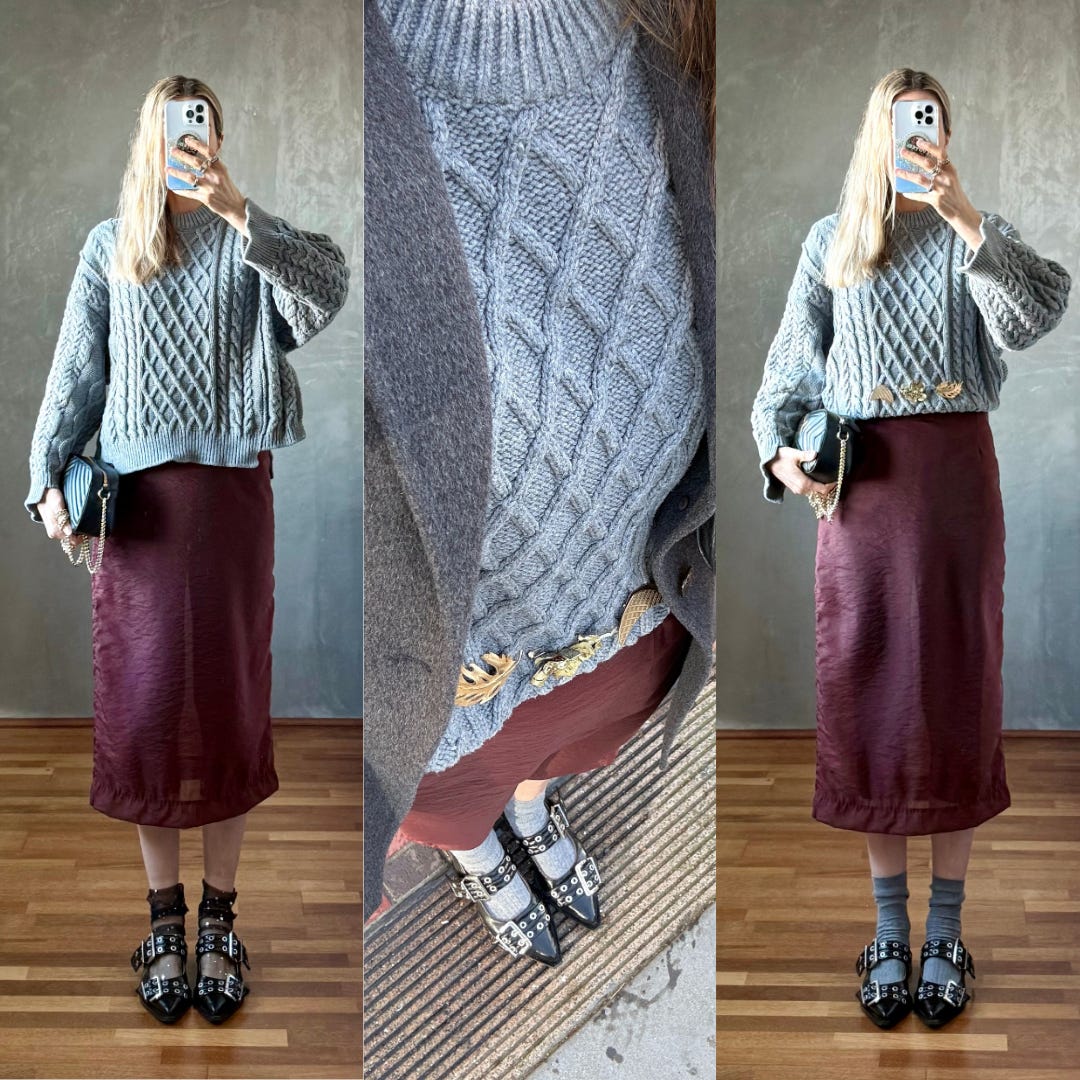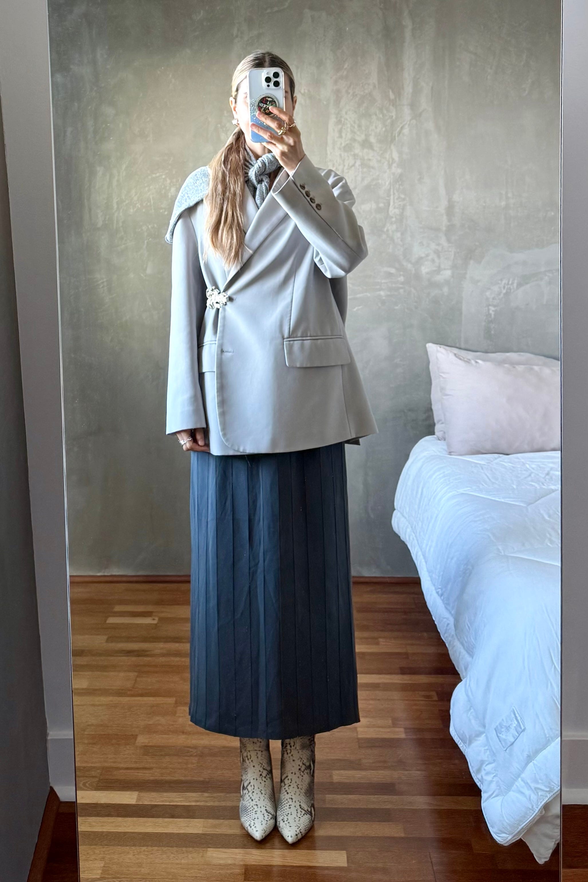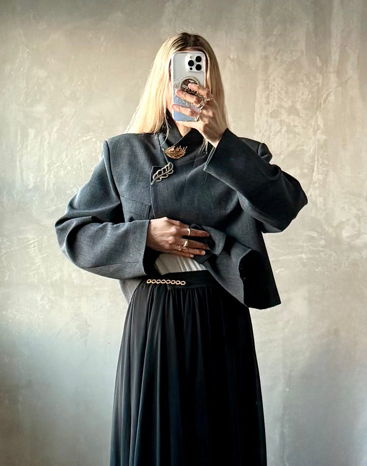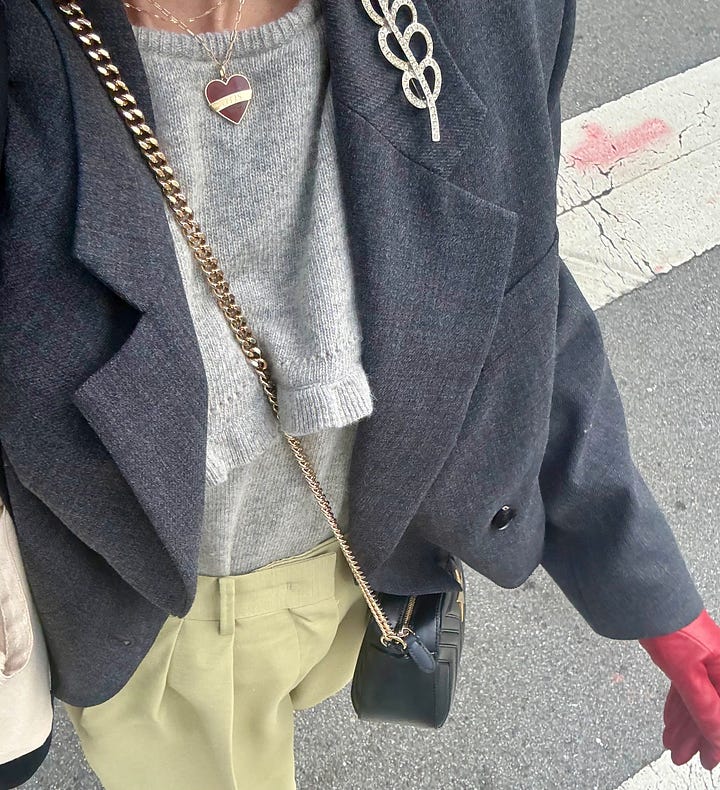 One of my biggest styling wins in 2025 was pinning the lapel of my deep v-neck Ganni blazer closed. Sheer skirts aside, my style leans modest and I love a high neck. I’m also a longtime fan of mixing metals as a former jewelry buyer and felt very maximal minimalist when I paired my new-to-me rhinestone brooch with my vintage gold brooch.