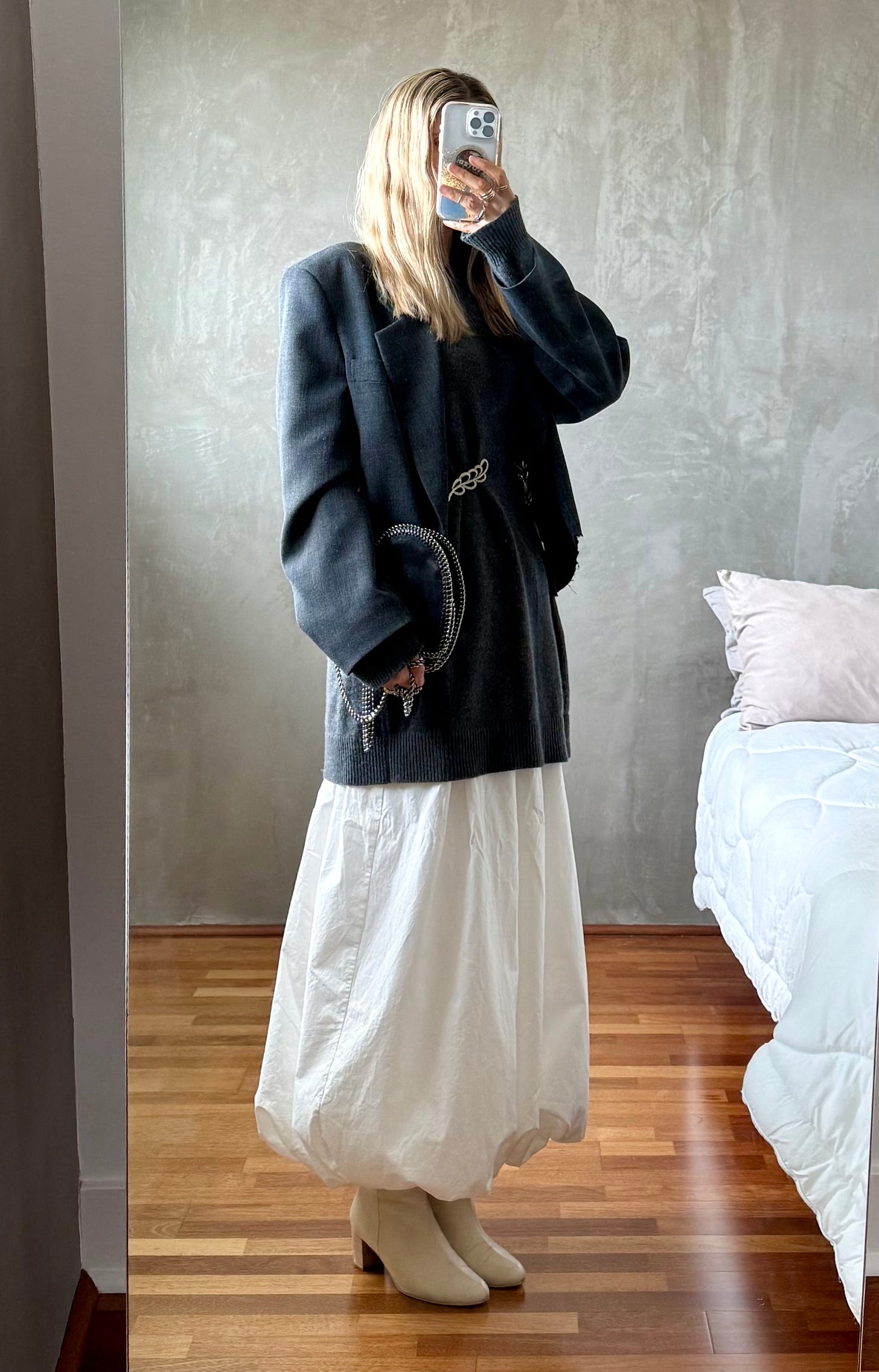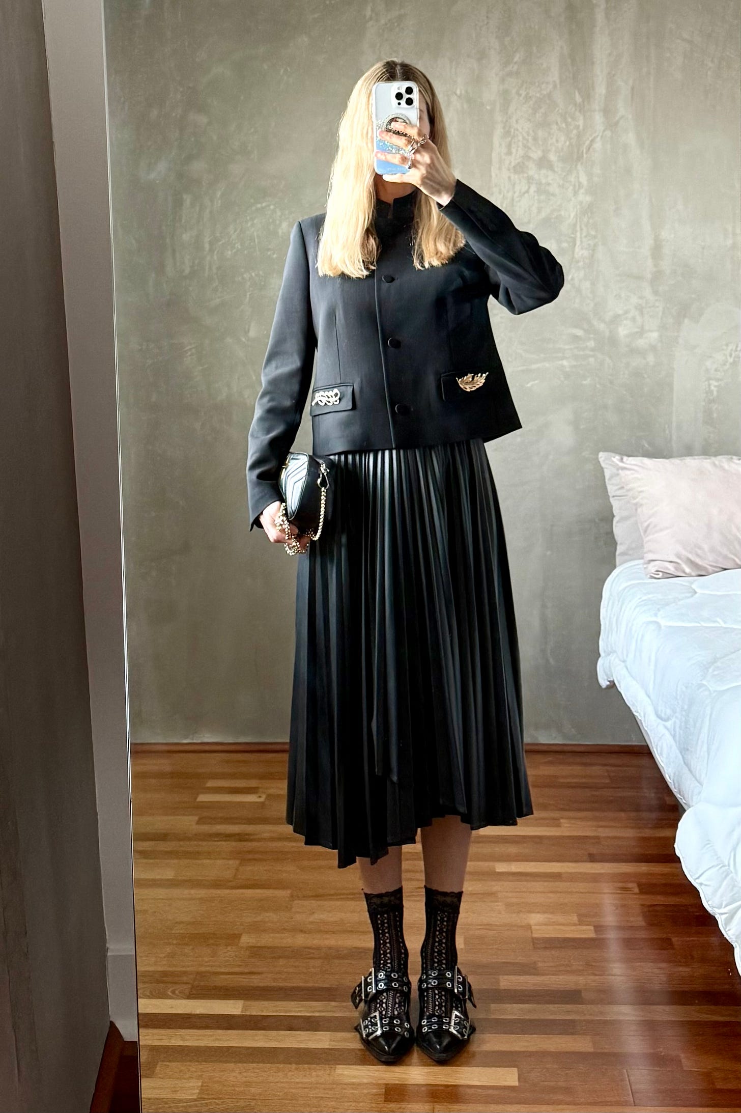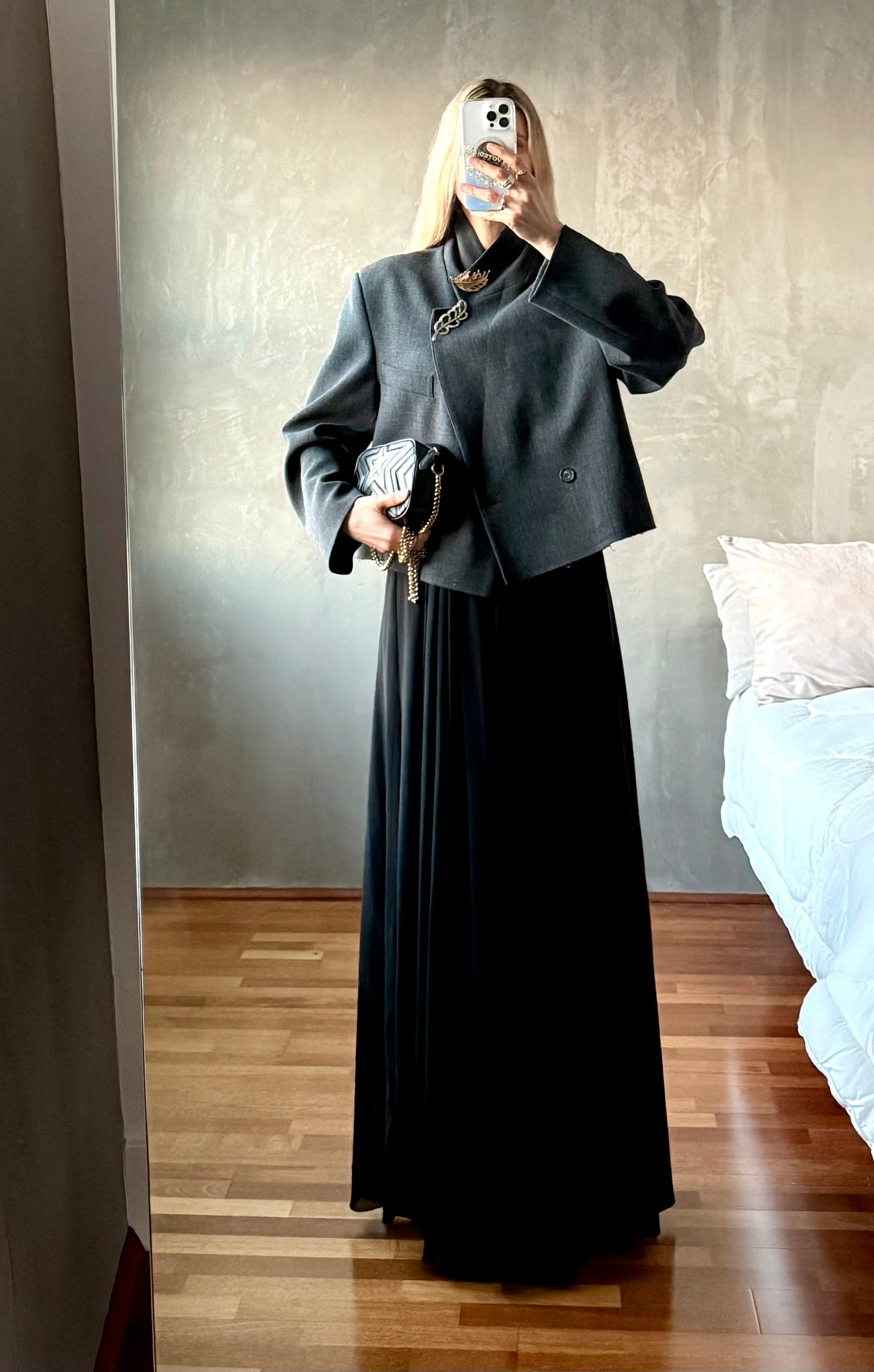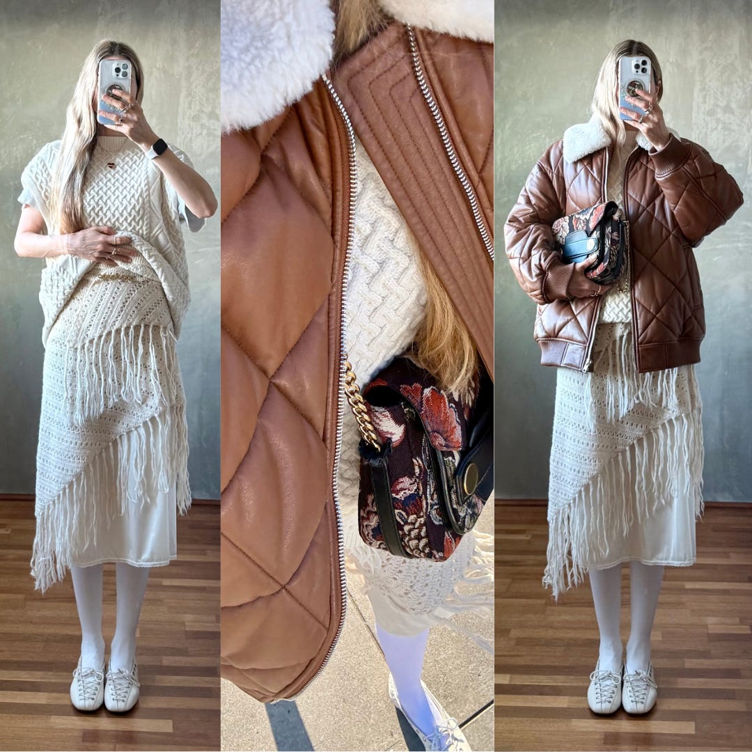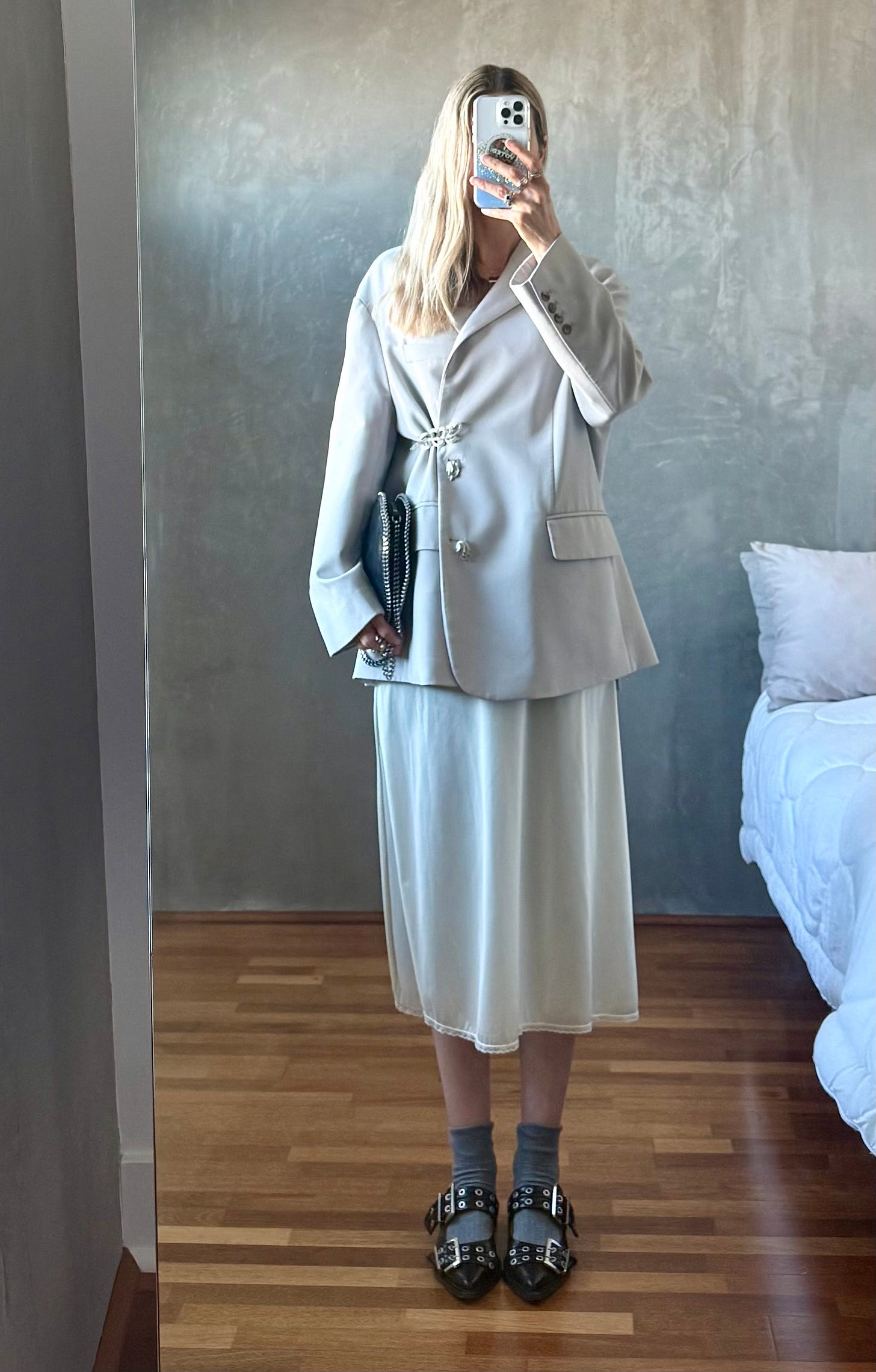One of my biggest styling wins in 2025 was pinning the lapel of my deep v-neck Ganni blazer closed. Sheer skirts aside, my style leans modest and I love a high neck. I’m also a longtime fan of mixing metals as a former jewelry buyer and felt very maximal minimalist when I paired my new-to-me rhinestone brooch with my vintage gold brooch.