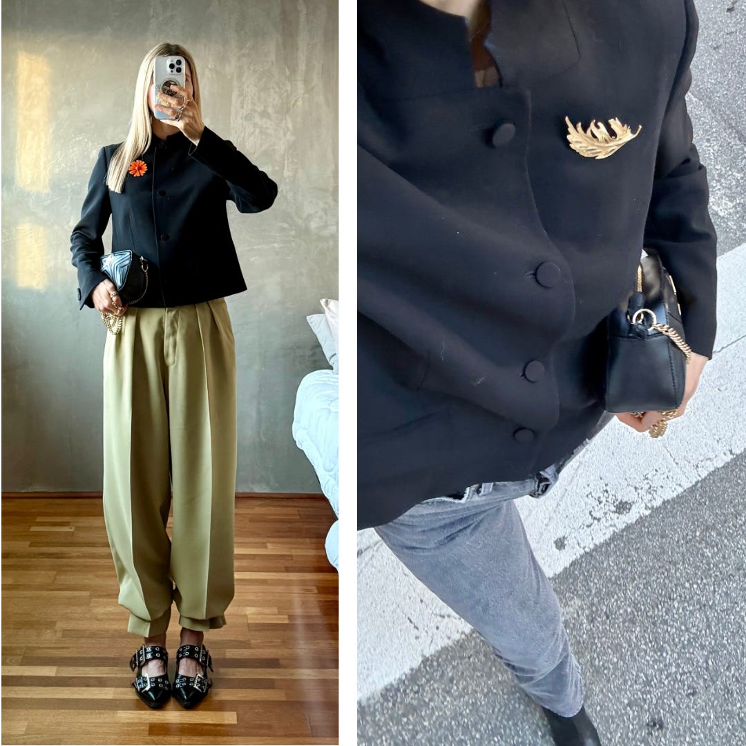 I can now rotate between these two posts and my January Trend Report, which delves into the origins of the 2020s reemergence of brooches with even more ways to style them.