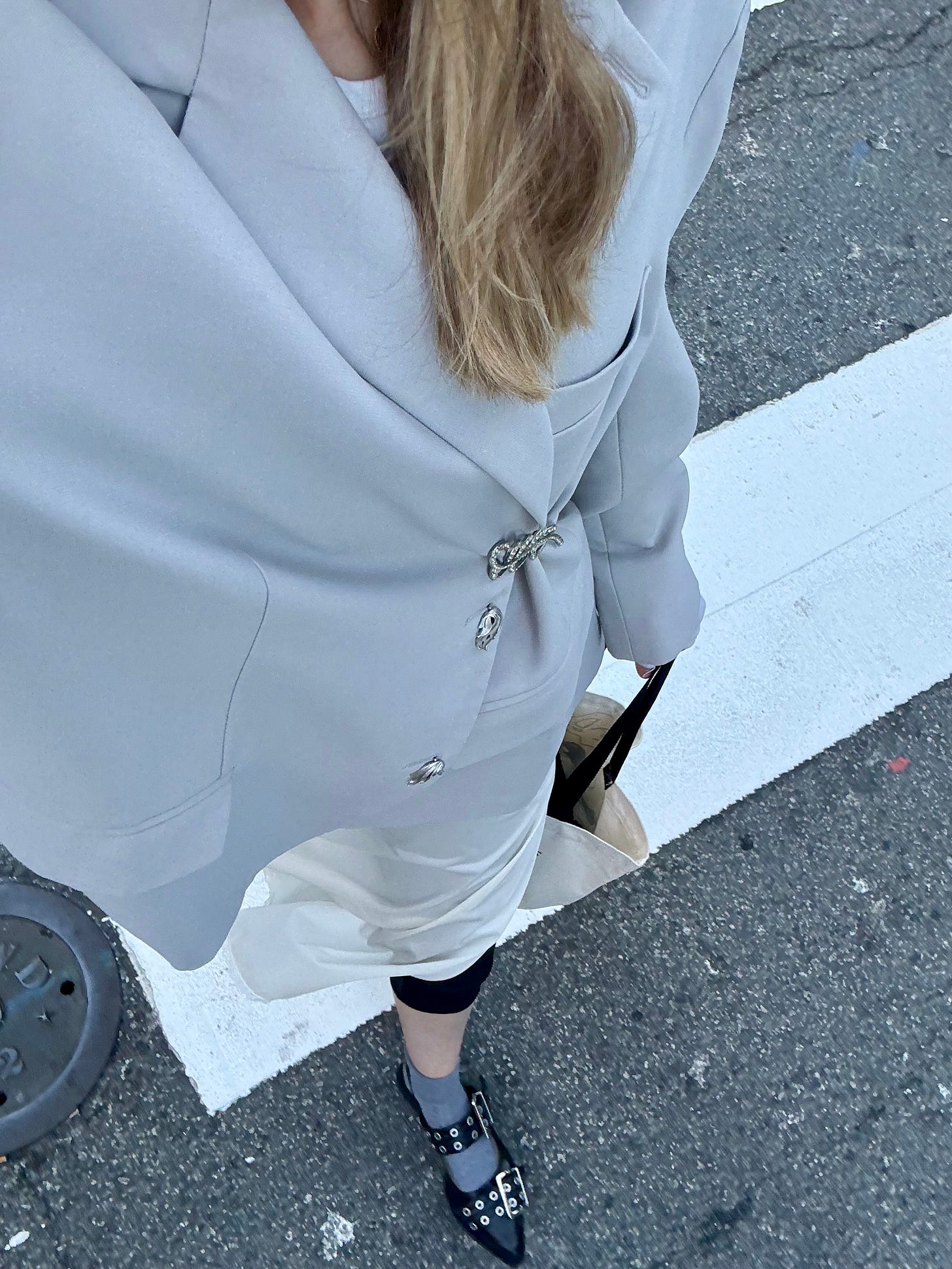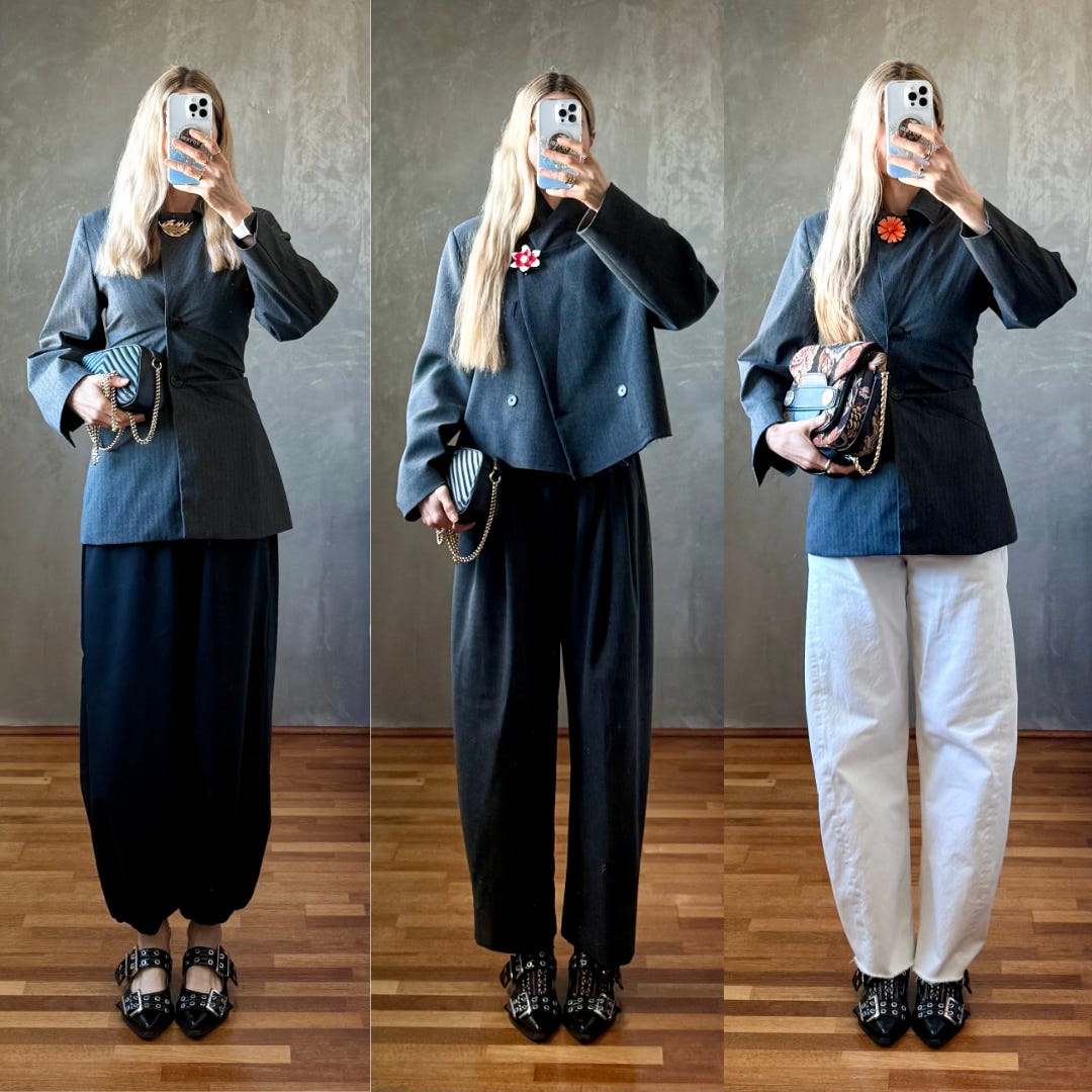 I loved my rhinestone brooch so much that I went right back to Long Live Vintage for a silver brooch and clip-on earring set2. I’ve been thinking about repurposing clip-on earrings as shoe clips for the longest time (my actual earlobes could never), but the first thing I did was clip my earrings into this blazer’s buttonholes taking inspiration from Jen Azoulay. I added my rhinestone brooch to pin my oversized blazer into a tailored shape, and a new way to cinch my jacket sans belt was born.