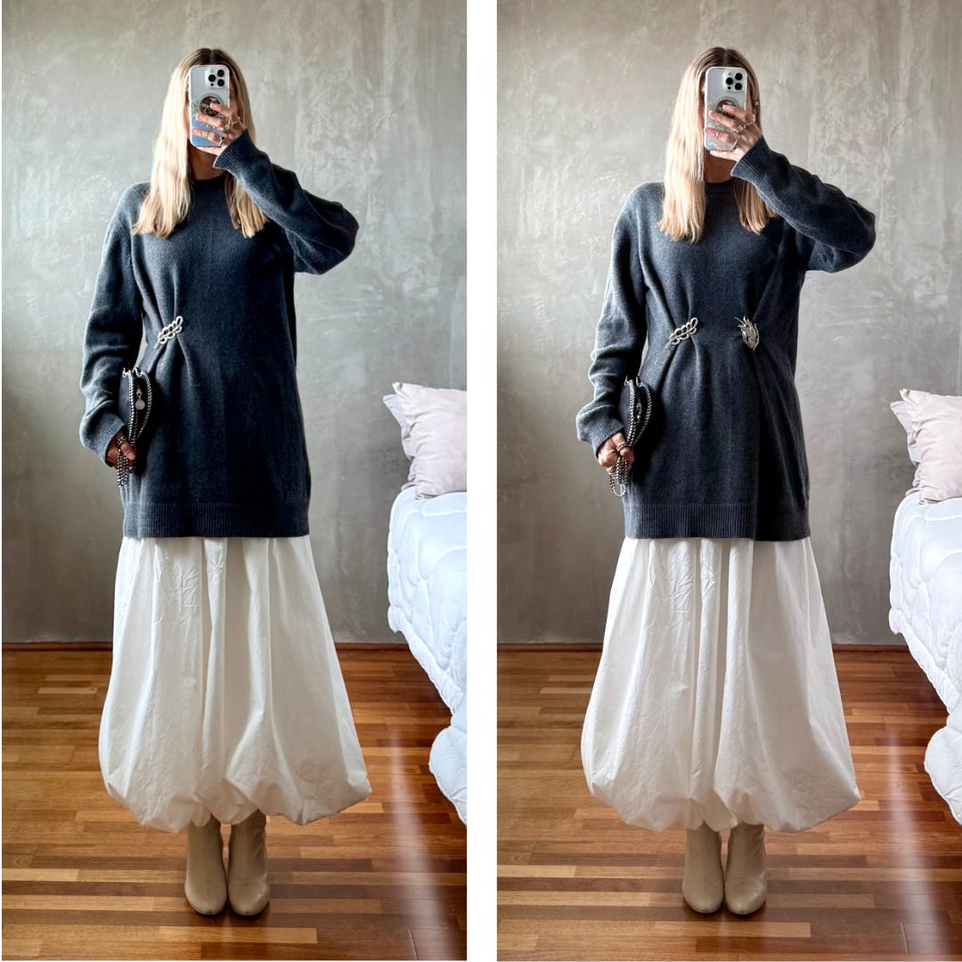 Brooch sweater styling has been one of the most interesting winter looks in my feeds and I’m still searching for the exact right giant jabot pin to align with the vision in my head. In the meantime l was on a roll with cinched waist dressing and styled my brooch two ways on my sweater, as an asymmetric and double cinch.