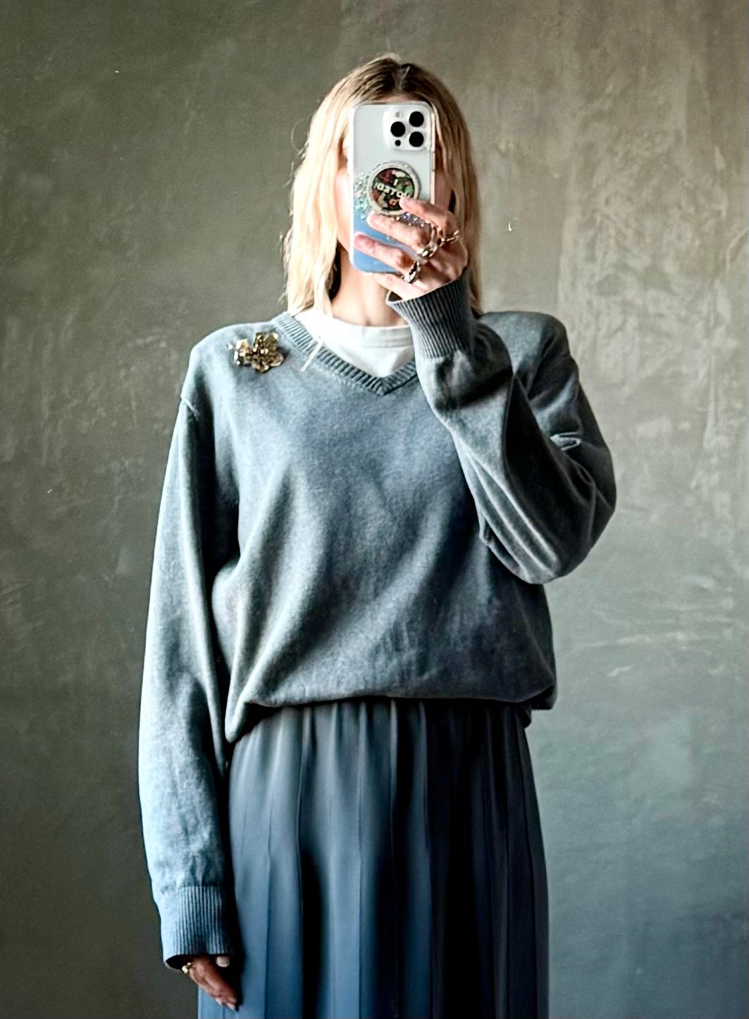I preferred the double brooch since it changed the shape of my oversized sweater the most and had great visual interest. I’m still figuring out how brooch pins impact my fabrics and only wore this outfit for a coffee shop visit that was 20 AIs long3.
